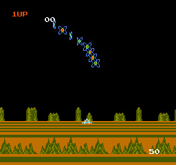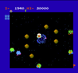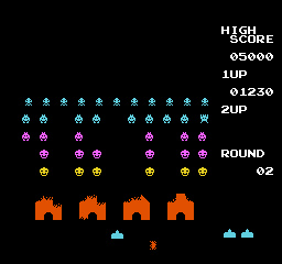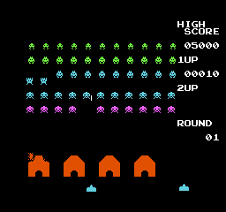 SPACE INVADER,俗稱太空侵略者,此類遊戲的史祖。從街機發源,在日美大受歡迎。之後的飛行射擊游戲都有它的影子。難度一樣高,敵人很快就來到下面,而且敵人子彈速度也不慢。玩家需要很快很準的擊破敵人,敵人到達下面就GAME OVER。紅白機版出現算有點晚,在變化上沒有同年推出的GALAGA來的好玩。