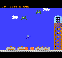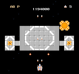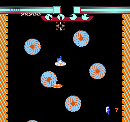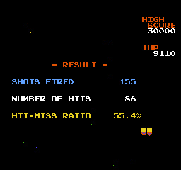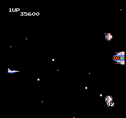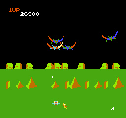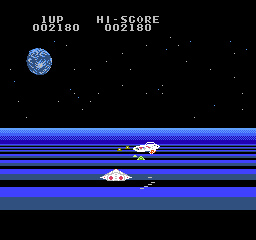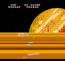 EXERION,紅白機第二款飛行射擊游戲。採第三人稱角度,仿3D畫面,算是創舉但也因此限制了關卡的差異性。結果就是單調的遊戲內容跟畫面。敵人都是一隊一隊出現,需要全部打倒,場景只有四種。遊戲中敵角色一覽請見此網站。