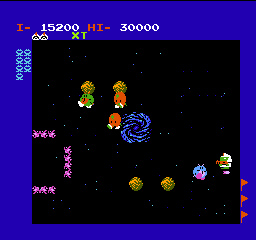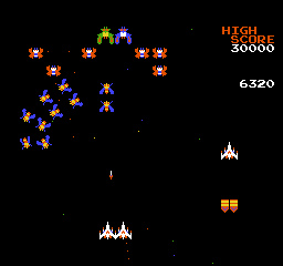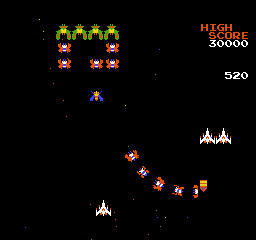 GALAGA,俗稱大蜜蜂,GALAXIAN的續作。跟前作差不多但子彈數可連發而且敵人有捕獲光線吸收主角的船,將此敵人打倒可以收回此船隻,但要小心不要打到自己飛機。也有獎勵關卡。關卡數高達255,之後會出現亂碼。此外單單只是一款單純遊戲。