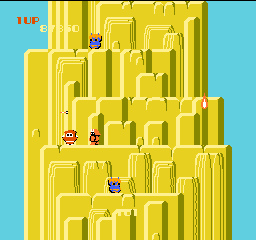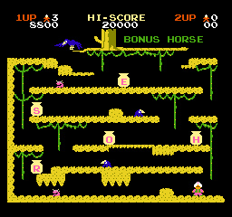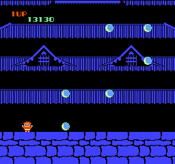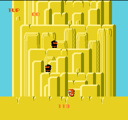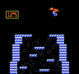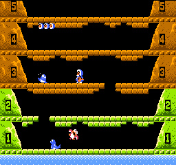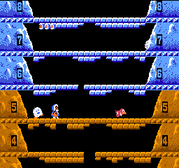 ICE CLIMBER,當時的熱門遊戲。兩位登山者POP跟NANA一邊打掉樓層一邊往上爬,在最高層以抓住大鳥為目地。關卡可以直接選擇,雖然都大同小異,但人物鮮明敵人變化大跟生動因此讓人感覺非常有趣。最上層的梯子很容易踩空,一旦跌下來算是登岳失敗但游戲不會結束。這也是適合雙人的遊戲之一。遊戲中敵角色一覽請見此網站。