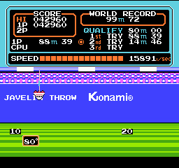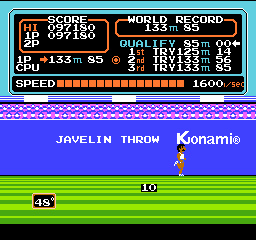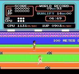 HYPER OLYMPIC/TRACK & FIELD,紅白機第一款奧運主題遊戲。比賽項目共有100米短跑,跳遠,標槍,110米跨欄,鏈球跟跳高。遊戲目的就是得到第一名,而操作方式就是快速按鈕,有的需調整角度,如跳高跟標槍等等。這遊戲適合多人玩,而且彩蛋也不少,非常有趣。操作跟彩蛋出現方式。
