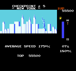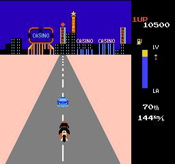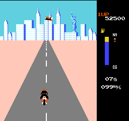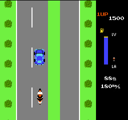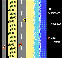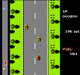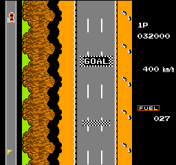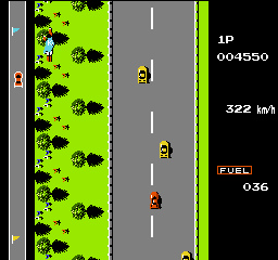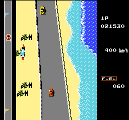 ROAD FIGHTER是鳥覽式賽車比賽,不一樣的不是跟對手比而是時間限制賽但路上障礙物比較多,如汽油水漬或其他車輛。基本上游戲方式還是以比較單調的步調前進,共四種不同賽道而已,吃彩虹車可以加油量。要是一直沒撞車,左邊會飛出超人加分。
